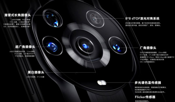 荣耀 Magic3 至臻版采用主摄+黑白镜头+长焦镜头+超广角的四摄设计。搭载5000万像素超清主摄(1.28”英寸的索尼IMX700,OIS光学防抖)+6400万像素超广角镜头+6400万像素潜望式长焦镜头(3.5倍光学变焦,10倍混合变焦,100倍数字变焦,支持光学防抖)+6400万像素黑白摄像头。8*8dTOF激光对焦系统,8色彩通道多光谱色温传感器。前置相机则采用1300万像素100°超广角镜头+3DTOF深感摄像头;支持AI智慧感知,3D人脸解锁。