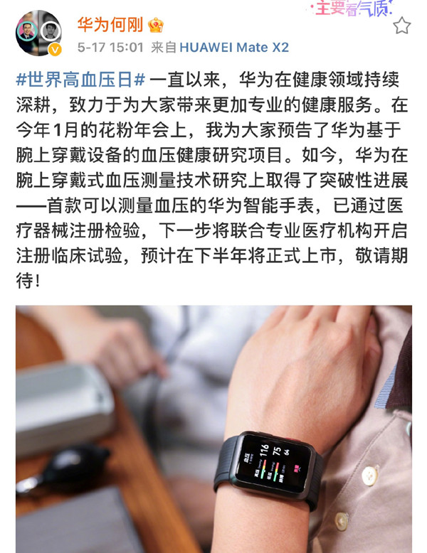 华为将与国内知名机构启动高血压管理研究,目标是基于华为可穿戴血压测量设备,联合业界专家,探索从筛查到早期干预的血压创新主动健康管理。华为消费者业务COO何刚也表示华为将在健康领域持续深耕,为大家带来更加专业的健康服务。