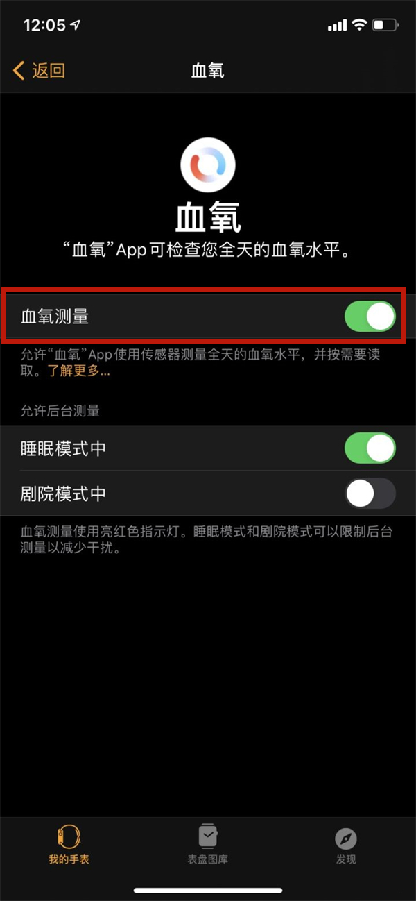 2、在血氧页面将血氧测量右侧开关开启即可。