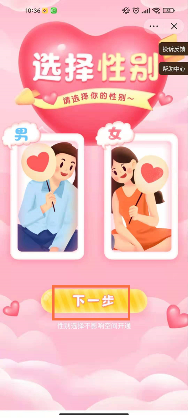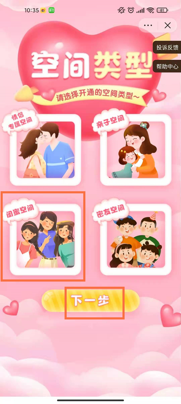 3、点击“闺蜜空间”,点击“下一步”。