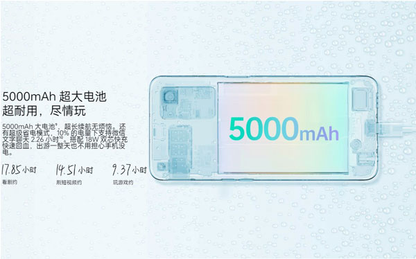 OPPO A93s 搭载基于 Android 11 的 ColorOS 11.1 系统,美观、流畅、省电、简洁且实用各种优点集于一身,内置 5000 mAh 超大电池,配合较低功耗的天玑 700 处理器和省电的 ColorOS 11.1 系统,拥有超强的续航。手机还有超级省电模式,开启之后即使还剩下 10% 的电量也能支持微信文字聊天 2.26 个小时,紧急情况下也能与家人保持联络。而且 OPPO A93s 支持 18W 有线快充,充电不焦虑,快速回复手机状态。