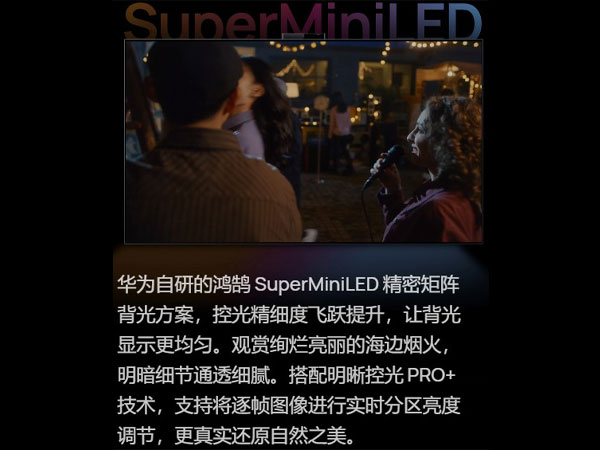 华为智慧屏v75super使用了华为自研的鸿鹄SuperMiniLED精密矩阵背光解决方案。75吋的屏幕下放置了46080枚MiniLED芯片,芯片面积0.075mm2,仅为传统LED灯珠面积的1/120。其拥有2880个物理背光分区,再辅以明晰控光PRO+技术,入眼便是千万级的超高对比度,而且峰值亮度达到了3000nit,画面清晰细腻,色彩真实自然。