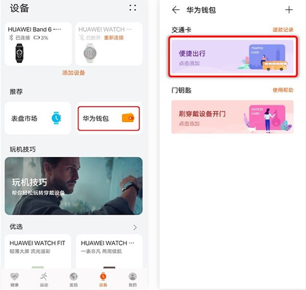 1、打开“运动健康”App,在 “设备”页面点击“华为钱包”。