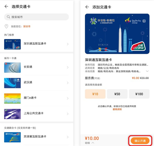 2、选择需要添加的交通卡,选择充值金额并付款即可。