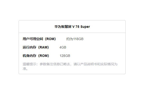 华为智慧屏v75super内存多大?华为智慧屏v75super用户可用空间约为118GB,运行内存为4GB,机身内存是128GB。