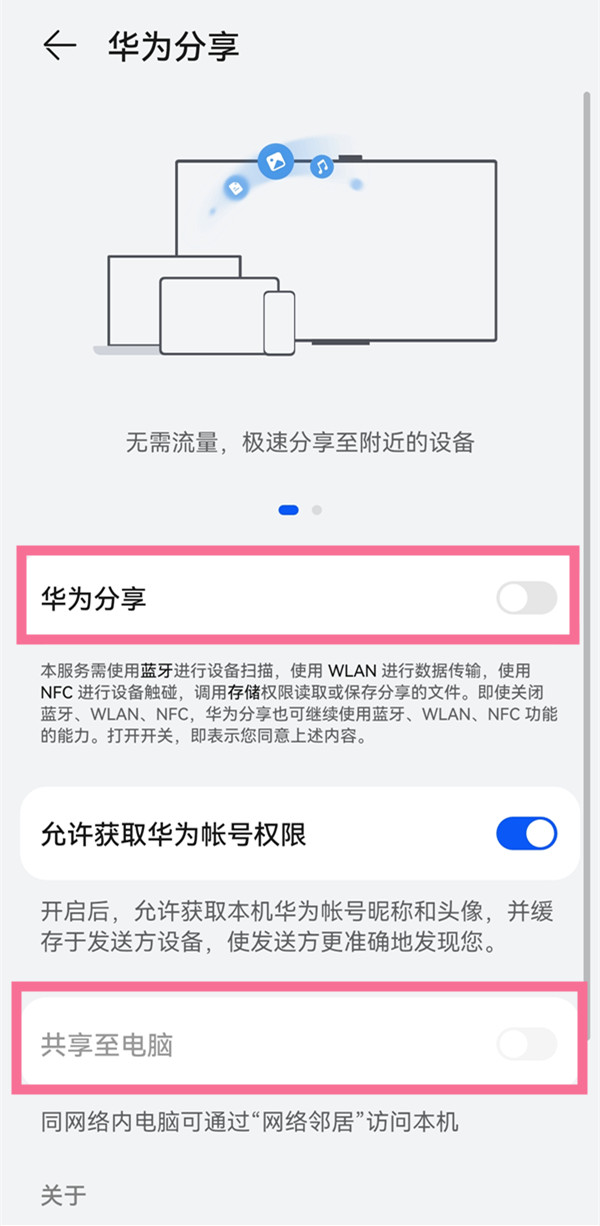 3、打开【华为分享】和【共享至电脑】开关。