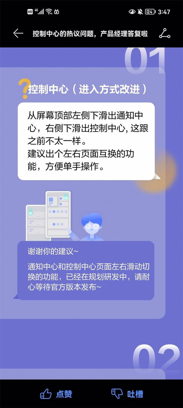 近日,华为产品经理官方回复这一热议问题,表示将在后续版本中支持控制中心和通知中心左右滑动切换,大家还请耐心等待。