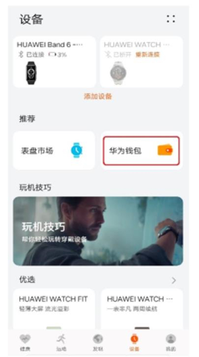 2、在华为运动健康 App“设备”界面,点击已连接的华为手环6pro,选择“华为钱包”。