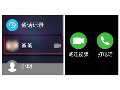 3、华为手机畅连通话:进入手机联系人界面,选择屏幕底部的 畅连通话 页签,选择需要呼叫的手表联系人,点击 摄像机 图标 即可发起视频通话。