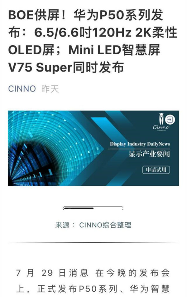 据产业研究机构 CINNO 称,华为 P50 系列采用了京东方 BOE 供货屏幕,包括 6.5 英寸 90Hz/6.6 英寸 120Hz 2K 柔性 OLED 屏幕。华为 P50 Pro 采用 3D 微曲的曲面屏,P50 采用 2.5D 纯平设计,延续经典,唯美纯粹;创新万象双环,构筑审美新秩序。