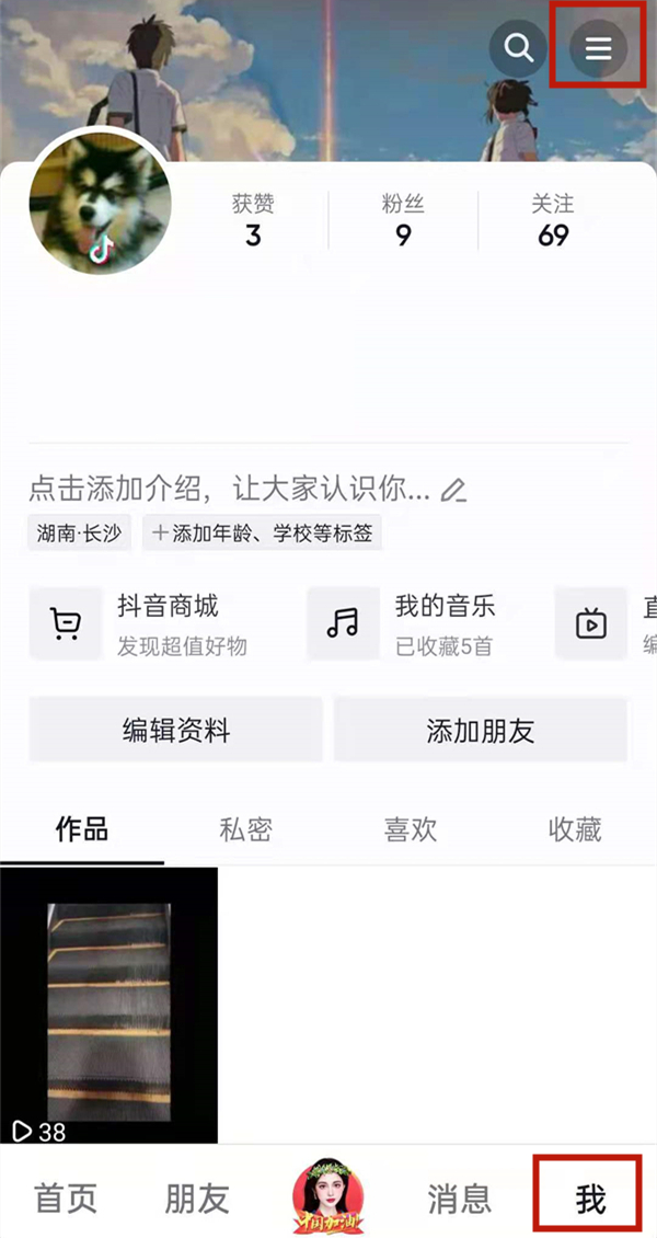 1、打开抖音app,在“我”页面点击右上角三根横线。