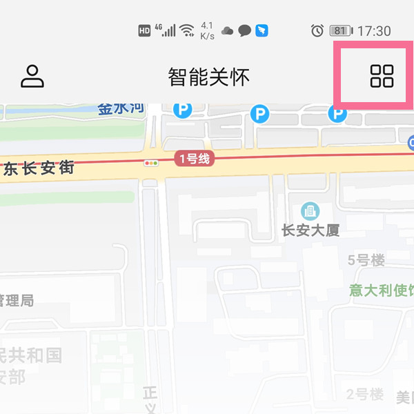 1、打开华为智能关怀APP,点击右上角方框键进入功能界面。