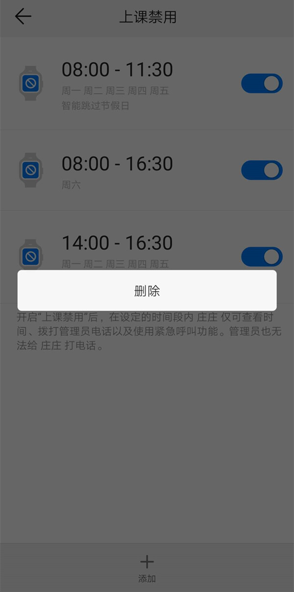 2、找到上课禁用功能,长按需要解除的时间段,点击【删除】即可。