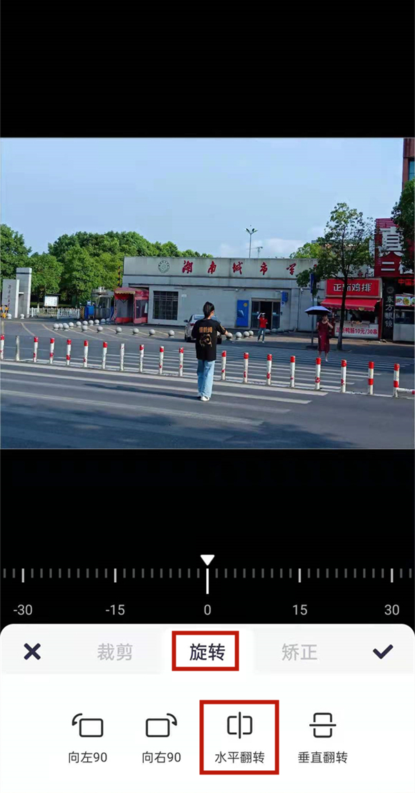 3、在编辑页面选择旋转后,点击水平翻转即可。