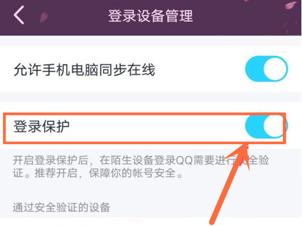 3、点击登录设备管理,将【登录保护】右侧的开关开启即可。
