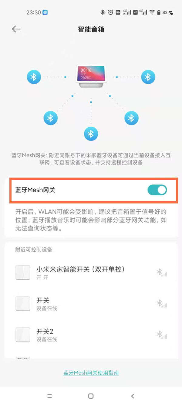 2、然后在列表中确认设备是否已经存在,点击“小爱音箱”→点右上角""→更多设置→蓝牙网关→蓝牙mesh网关已开,就表明门锁已经关联到小爱音箱蓝牙网关。