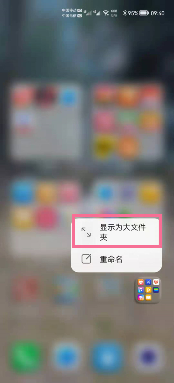 2、长按建立的文件夹,选择【显示为大文件夹】可更改文件夹显示大小。