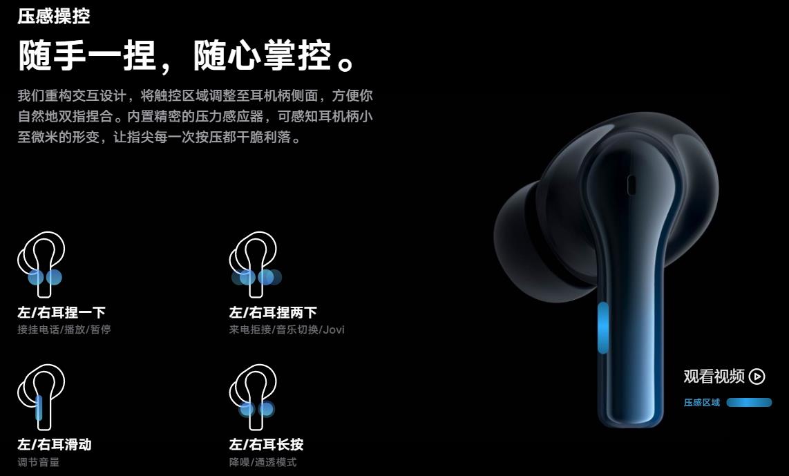 左/右耳捏一下可接挂电话/播放/暂停;左/右耳捏两下可来电拒接/音乐切换/Jovi;左/右耳滑动调节音量;左/右耳长按降噪/通透模式。适配蓝牙耳机的机型使用时,可进入手机设置--(其他网络与连接)--蓝牙,找到耳机名称并点击最右的”>”符号机进入功能管理界面,自定义修改双击功能。