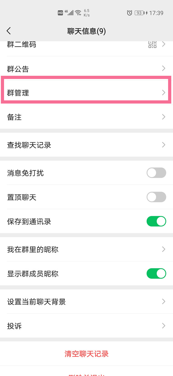 1、在群聊天界面点击右上角三点进入聊天信息界面,点击【群管理】。