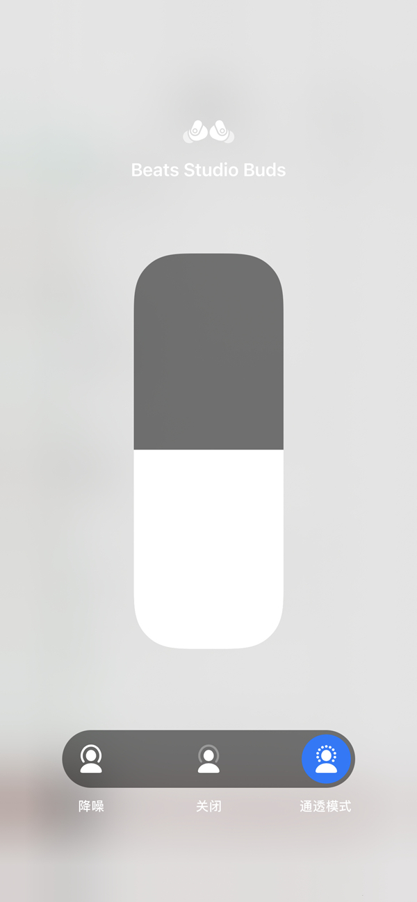 2、设置中调节:在苹果手机设备上打开“控制中心”,佩戴好 Beats Studio Buds 后,按住音量滑块直至您看到额外的控制项。轻点左下角的“噪声控制”图标,轻点“降噪”、“通透模式”或“关闭”。