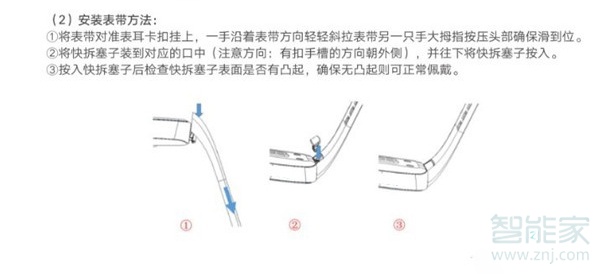 2、安装表带:将表带对准表耳卡扣挂上,一手沿着表带方向轻轻斜拉表带,另一只手大拇指按压头部确保滑到位;将快拆塞子装到对应的口中(注意方向:有扣手槽的方向朝外侧),并往下将快拆塞子按入;按入快拆塞子后检查快拆塞子表面是否有凸起,确保无凸起则可正常佩戴。