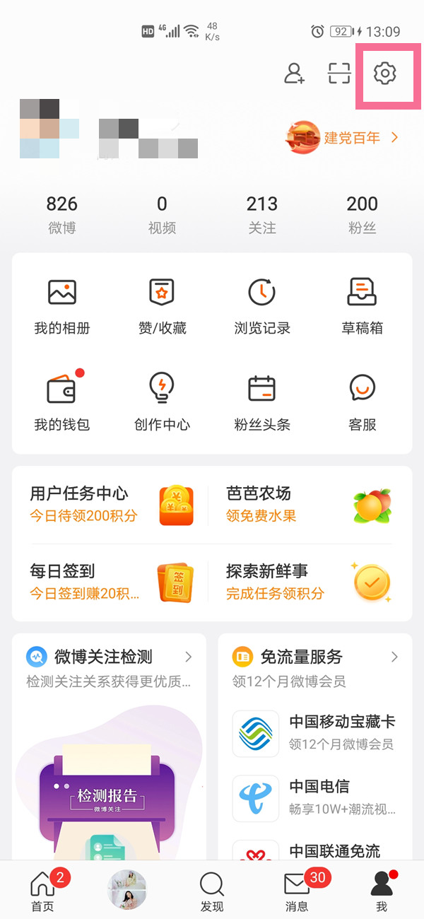 1、在微博“我”界面点击右上角齿轮设置图标。