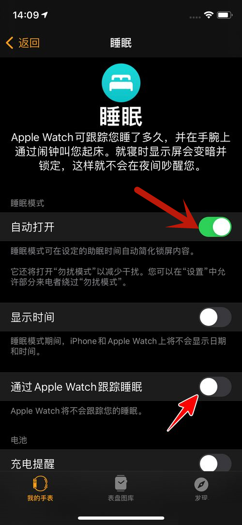2、将“自动打开”和“通过 Apple Watch 跟踪睡眠”右侧的开关开启即可