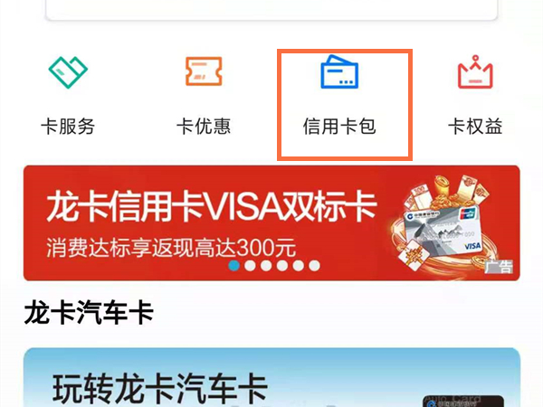 2、点击“信用卡包”菜单查看名下状态正常的龙卡信用卡。