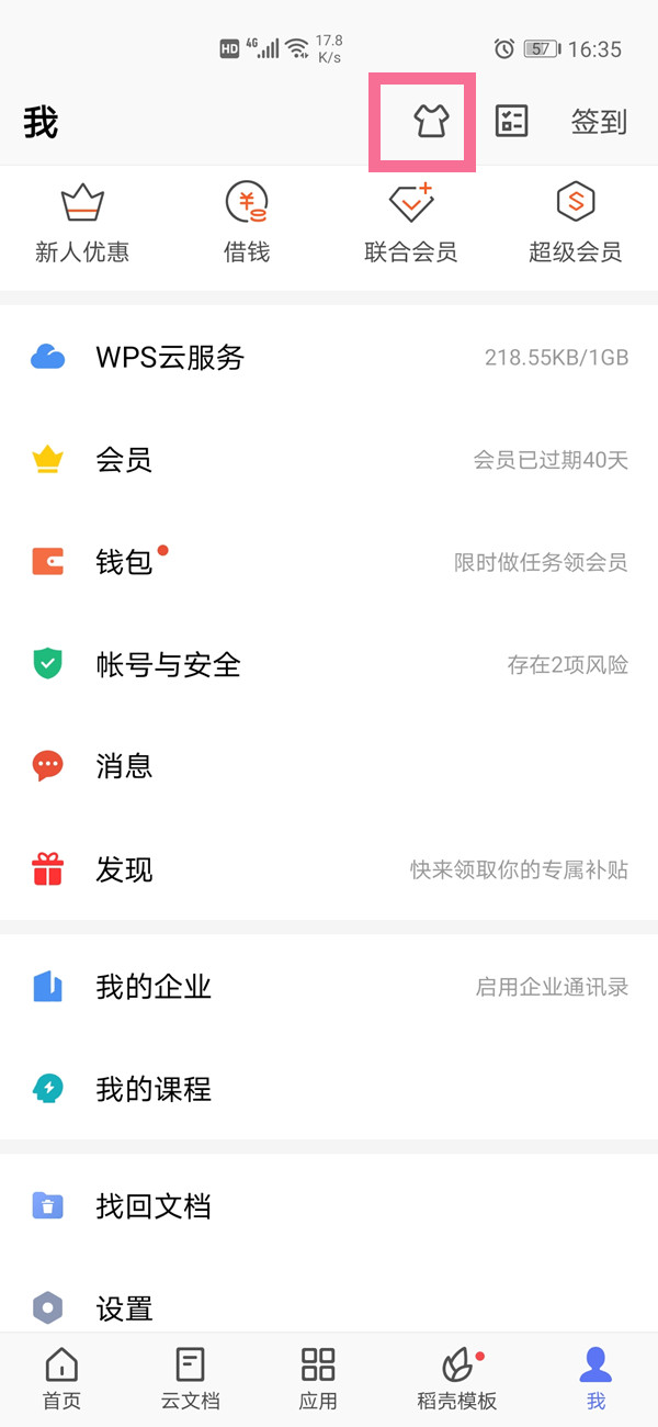 1、打开手机WPS,在“我”界面点击右上角皮肤图标。