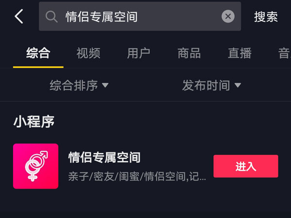 1、打开抖音,搜索情侣专属空间,点击进入。