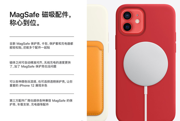 在iPhone12系列手机发布会上,苹果还带来全新的MagSafe磁吸无线充电技术。历代iPhone无线充电功率均止步于7.5W,MagSafe磁吸充电技术将无线充电性能提升至双倍,最高功率达15W。除MagSafe磁吸充电外,iPhone12全系列仍支持通用性广泛的Qi无线充电,功率最高达7.5W。用户需要更快的充电速度可使用原装MagSafe磁吸充电器,而市面上广泛流通的的Qi无线充电器一样可以继续使用。