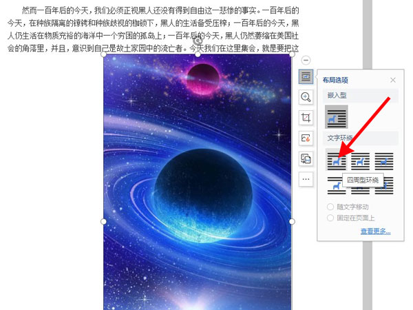 2、鼠标左键点击图片,点击布局选项图标,选择四周型环绕即可。