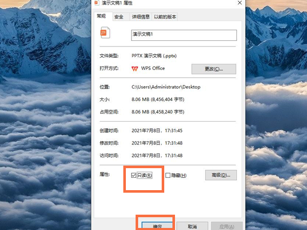 2、将只读前面的勾取消,再点击确定即可。