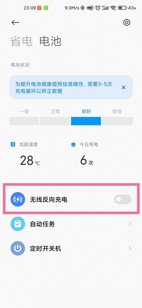 2、在“电池”页中开启【无线反向充电】,然后将手机与需要充电的设备背靠背即可。