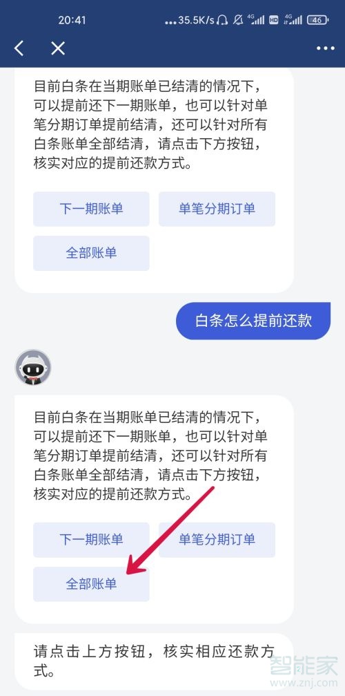 4、点击客服回答中的全部账单。