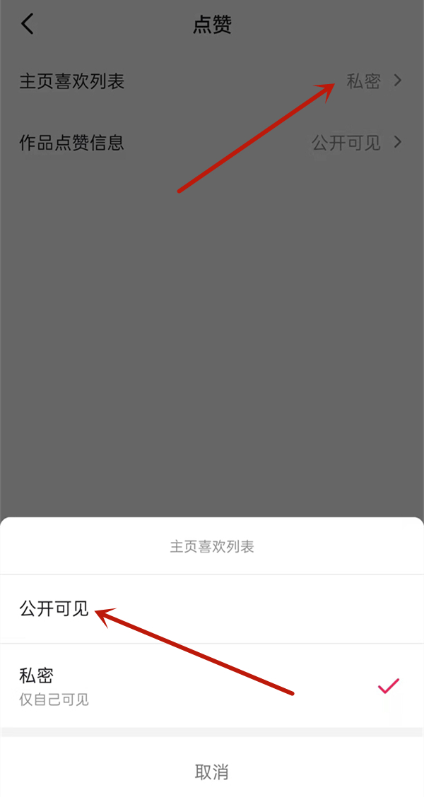 5、在点赞页面点击主页喜欢列表后,设为公开即可。