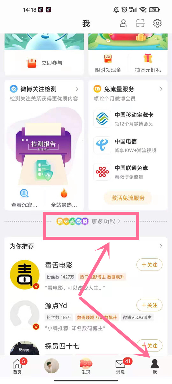 1、打开微博app,点击右下角的我,往下滑动页面,点击【更多功能】。
