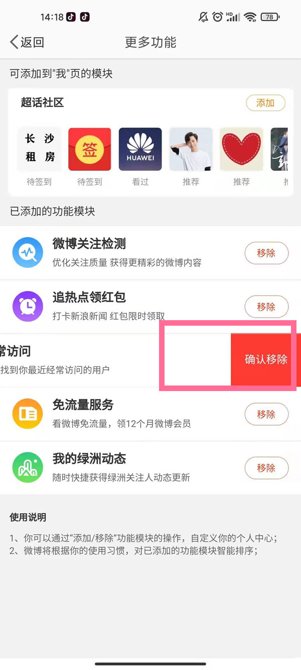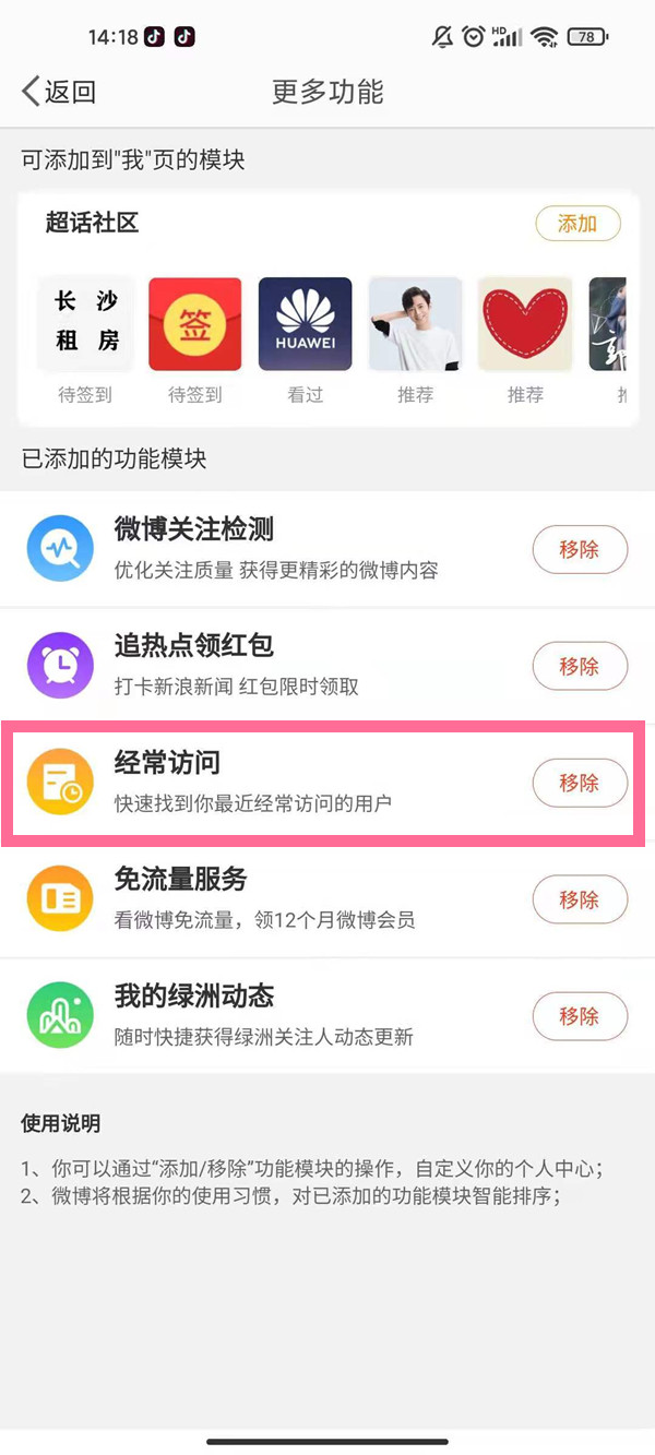 2、在功能模块页面找到【经常访问】,点击右侧移除。