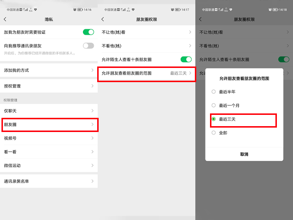 2、点击朋友圈,点击允许朋友查看朋友圈的范围,选择最近三天。