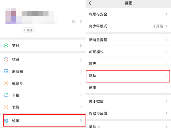 1、打开微信,点击我,点击设置,点击隐私。