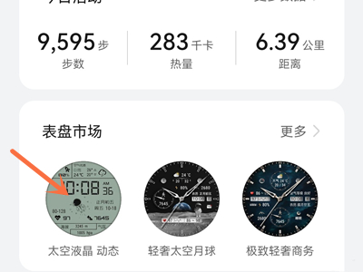 1、打开华为运动健康App中手表的设备详情页,进入表盘市场,选太空人表盘。