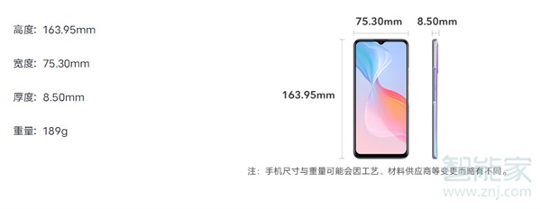 vivoy53s机身尺寸是多少?vivoy53s的长度为163.95mm,宽度为75.3mm,厚度为8.5mm,手机重量约为189g。