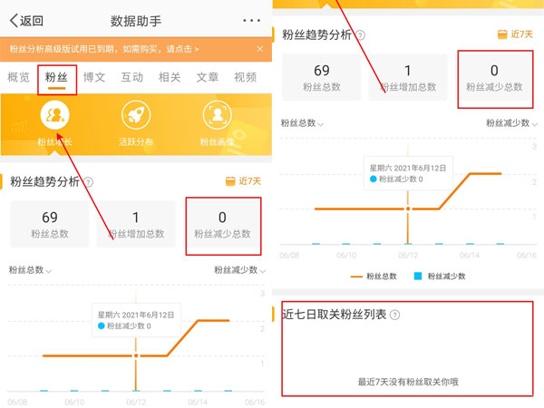 3、点击粉丝,在粉丝增长选项下可以看到粉丝减少总数和近七日取关粉丝列表。