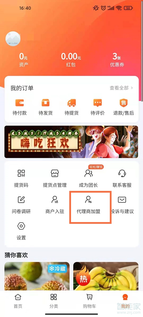 1、打开橙心优选app,在我的页面点击代理商加盟。