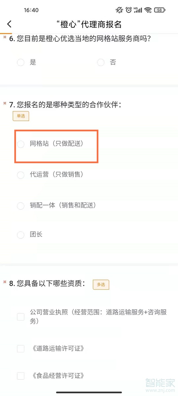 2、在“橙心”代理商报名页面填入信息,在有一项合作伙伴中勾选网格站(只做配送),完善后点击提交即可。