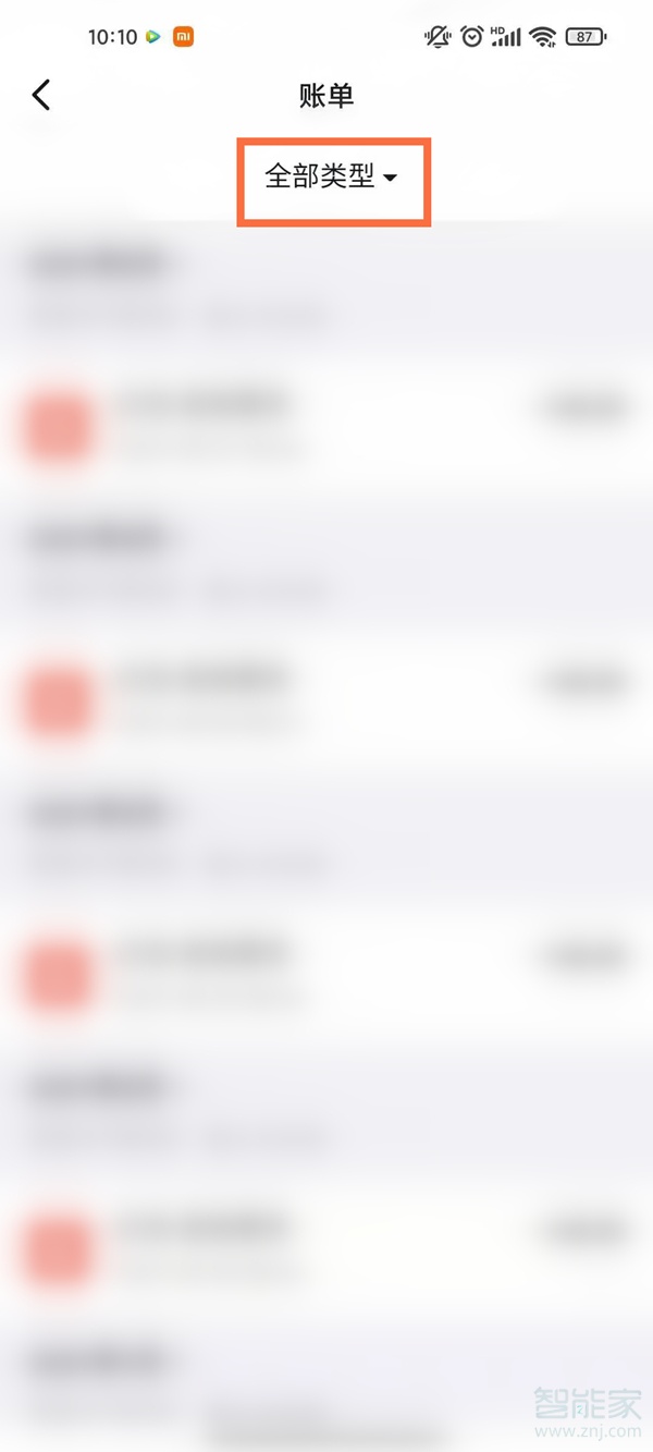 3、点击全部类型选项,在屏幕下方选择需要查看的账单类型点击确定即可。