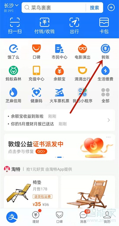 1、打开支付宝,点击转账。