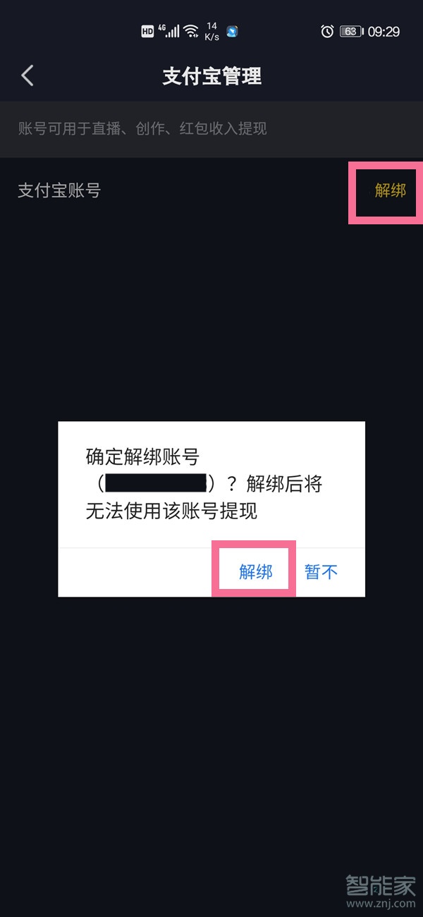 4、点击支付宝账号后面的【解绑】验证后即可解除绑定。