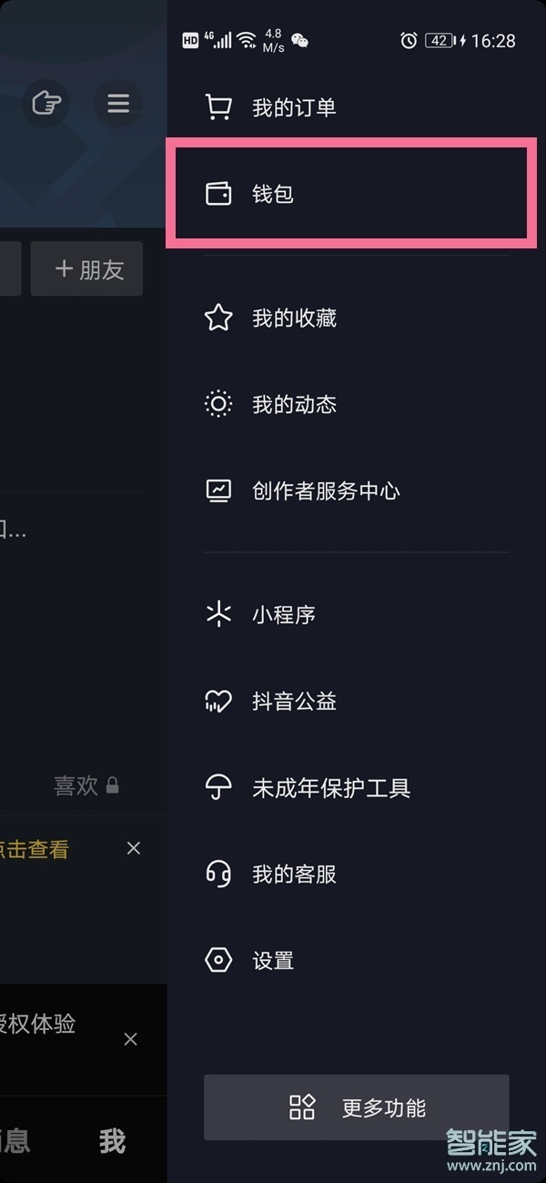 1、在抖音“我”界面点击右上角三横,选择【钱包】。
