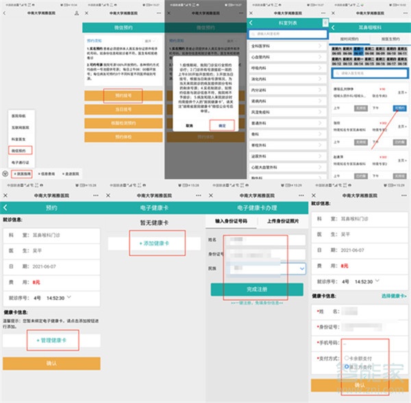 2、点击就医指南>微信预约,登录或注册账号,点击预约挂号,点击弹窗上的确定,选择挂号科室,选择时间和医生,点击可预约>管理健康卡>添加健康卡>完成注册,返回预约页面填手机号码,选择支付方式,点击确认即可。